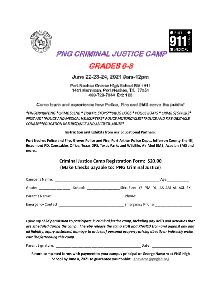 PNG CRIMINAL JUSTICE CAMP GRADES 68 June 222324, 2021 9am12pm Port Niches Groves High School RM 1011 1401 Merriam, Port Niches, TX. 77651 4097297644 Ext: 186Come learn and experience how Police, Fire