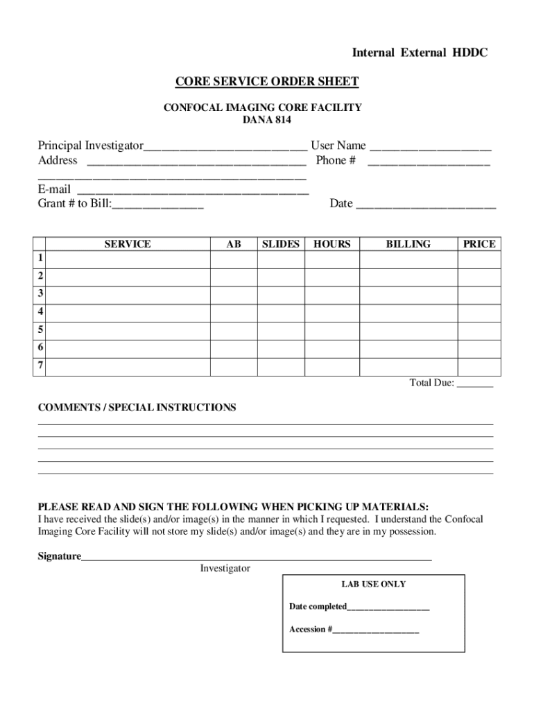 Internal External HVDC CORE SERVICE ORDER SHEET CONFOCAL IMAGING CORE FACILITY DANA 814Principal Investigator___ Username ___ Address ___ Phone # ___ ___ Email ___ Grant # to Bill:___ Date ___ SERVICEABSLIDESHOURSBILLINGPRICE1
