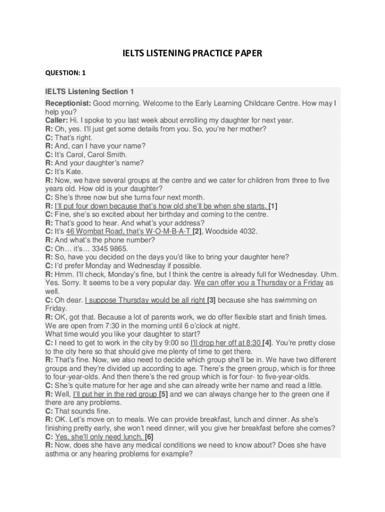 IELTS LISTENING PRACTICE PAPER QUESTION: 1 IELTS Listening Section 1 Receptionist: Good morning. Welcome to the Early Learning Childcare Center. How may I help you? Caller: Hi. I spoke to you last