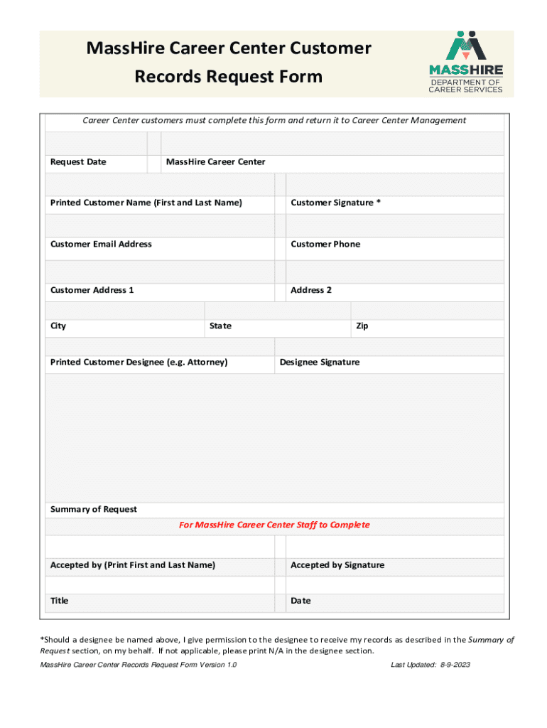 Massive Career Center Customer Records Request Form Career Center customers must complete this form and return it to Career Center ManagementRequest DateMassHire Career Fingerprinted Customer Name
