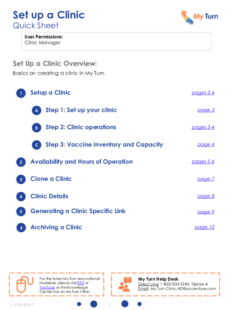 Set up a Clinic Quick Sheets Permissions: Clinic Manager Set Up a Clinic Overview: Basics on creating a clinic in My Turn.1Setup a Clinic pages 34AStep 1: Set up your clinic page 3BStep 2: Clinic