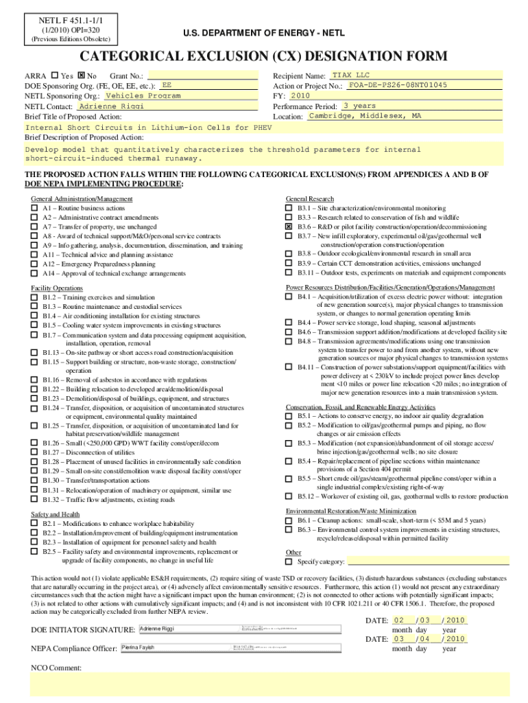 NET F 451.11/1 (1/2010) OPI320U. S. DEPARTMENT OF ENERGY NET(Previous Editions Obsolete)CATEGORICAL EXCLUSION (CX) DESIGNATION FORM AREA Yes No Grant No.: Recipient Name: TAX LLC DOE Sponsoring Org.