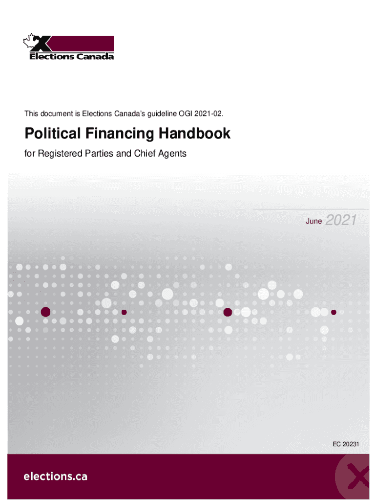 This document is Elections Canada's guideline CGI 202102. Political Financing Handbook for Registered Parties and Chief AgentsJune2021EC 20231Table of Contents|3Table of Contents About This Document