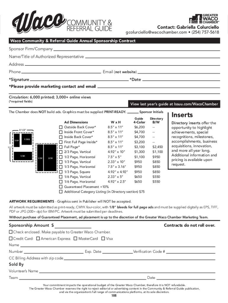 Contact: Gabriella Colurciellogcolurciello@wacochamber.com (254) 7575618 Waco Community & Referral Guide Annual Sponsorship Contract Sponsor Firm/Company Name/Title of Authorized Representative Address