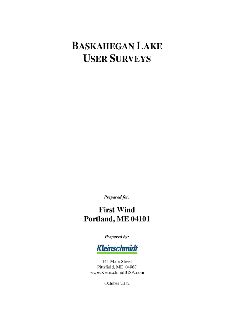 BASKAHEGAN LAKE USER SURVEYSPrepared for:First Wind Portland, ME 04101 Prepared by:141 Main Street Pittsfield, ME 04967 www.KleinschmidtUSA.com October 2012BASKAHEGAN LAKE USER SURVEYSPrepared for: