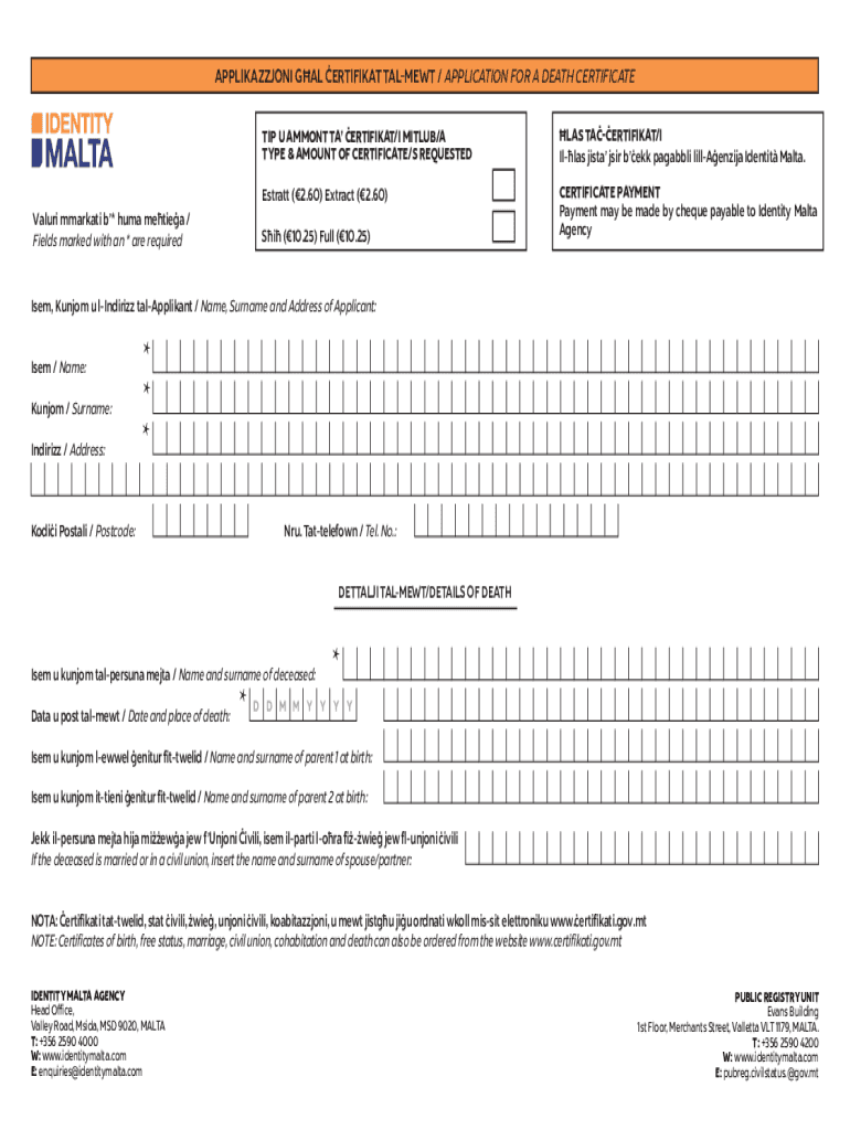 APPLIKAZZJONI GAL CERTIFICATE TALENT / APPLICATION FOR A DEATH CERTIFICATEValuri market b* human métier /