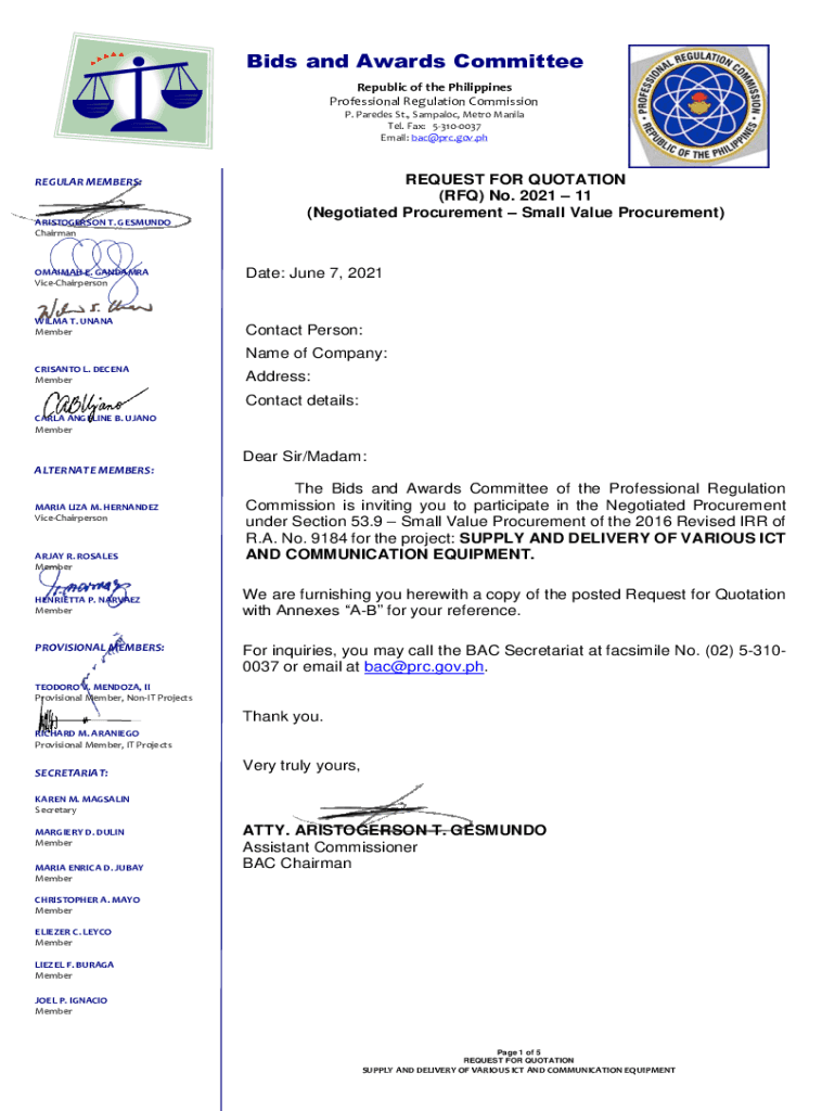 Bids and Awards Committee Republic of the Philippines Professional Regulation Commission P. Parades St., Sample, Metro Manila Tel. Fax: 53100037 Email: bac@prc.gov.phREGULAR MEMBERS:ARISTOGERSON T.