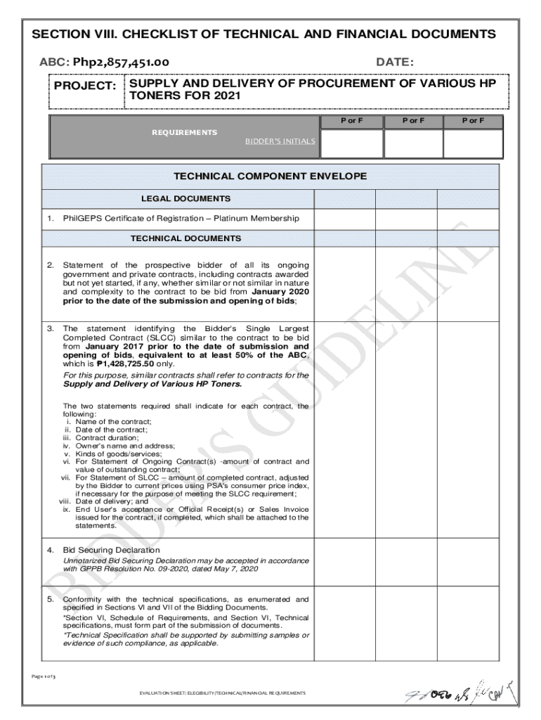 SECTION VIII. CHECKLIST OF TECHNICAL AND FINANCIAL DOCUMENTS ABC: Php2,857,451.00 PROJECT:DATE:SUPPLY AND DELIVERY OF PROCUREMENT OF VARIOUS HP TONERS FOR 2021 P or F REQUIREMENTSBIDDERS INITIALSTECHNICAL