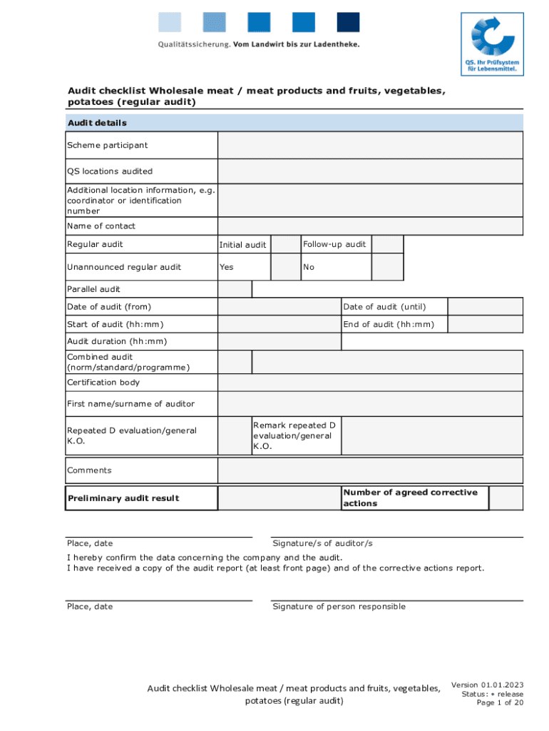 Audit checklist Wholesale meat / meat products and fruits, vegetables, potatoes (regular audit) Audit details Scheme participant QS locations audited Additional location information, e.g. coordinator