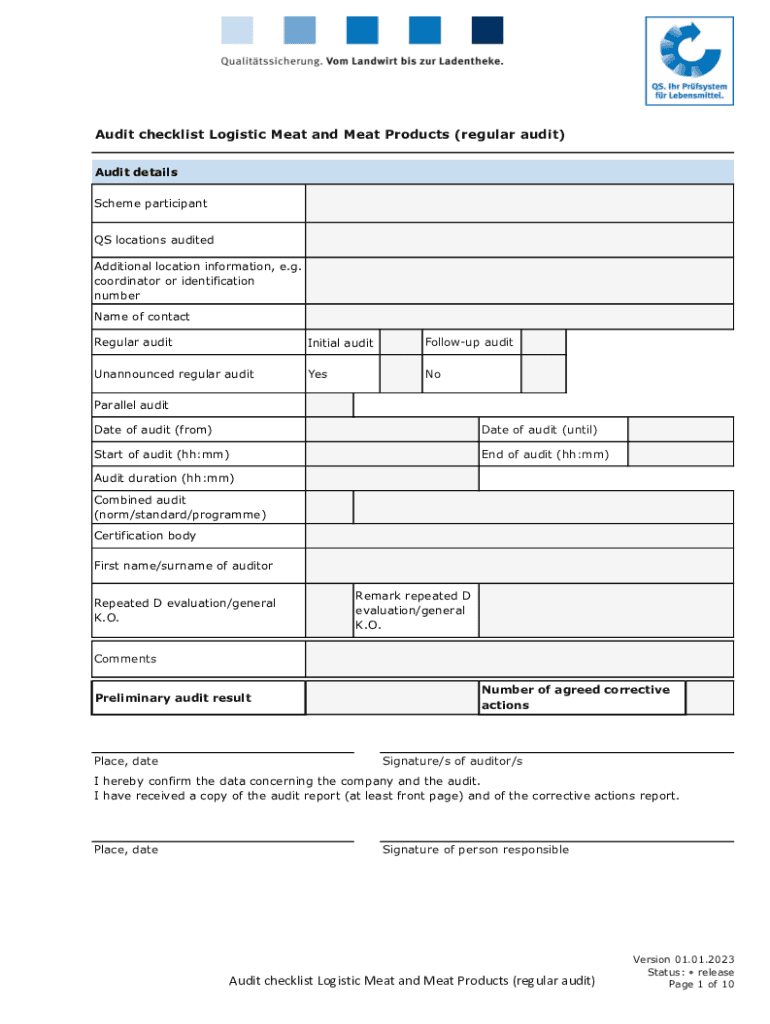 Audit checklist Logistic Meat and Meat Products (regular audit) Audit details Scheme participant QS locations audited Additional location information, e.g. coordinator or identification number Name