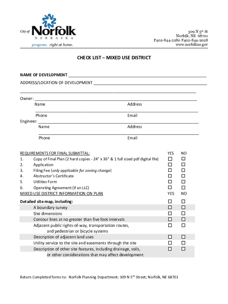 309 N 5th St Norfolk, NE 68701 P4028442280 F4028442028 www.norfolkne.govprogress. Right at home. CHECK LIST MIXED USE DISTRICT NAME OF DEVELOPMENT ___ ADDRESS/LOCATION OF DEVELOPMENT ___ ___ Owner: