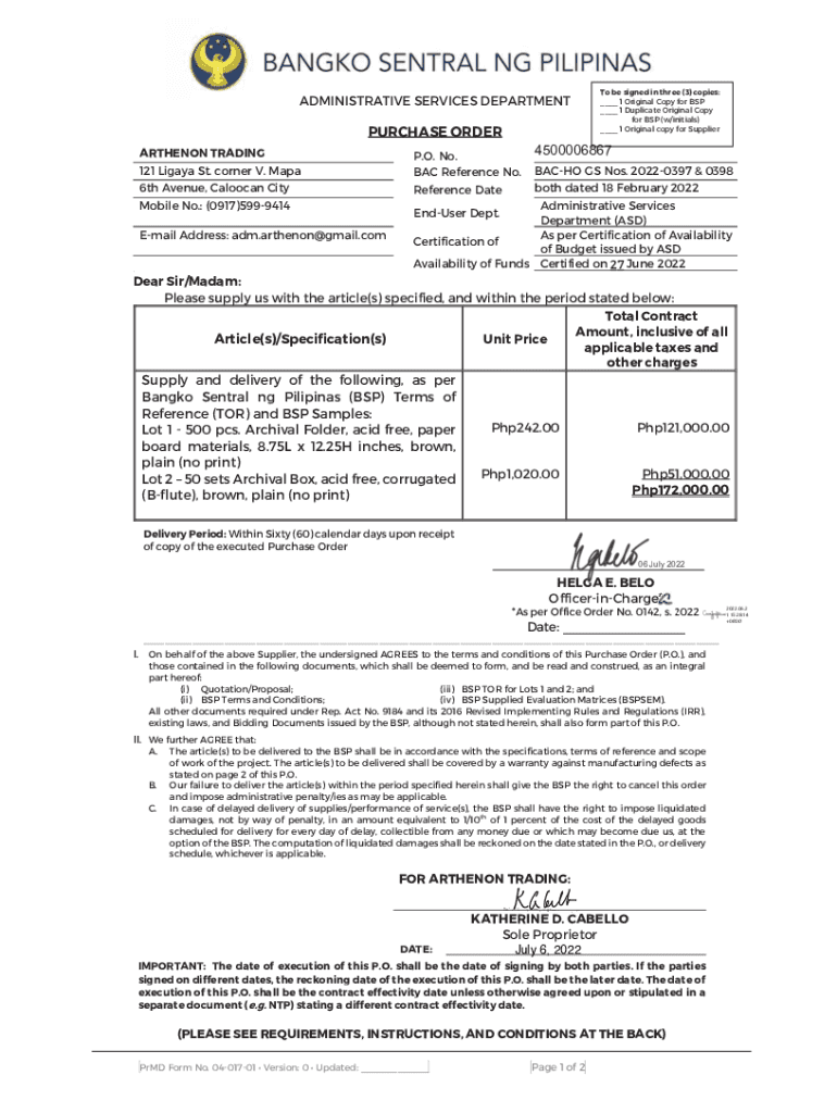 ADMINISTRATIVE SERVICES DEPARTMENTPURCHASE ORDER PARTHENON TRADING 121 Libya St. corner V. MAPA 6th Avenue, Caloocan City Mobile No.: (0917)5999414 Email Address: adm.arthenon@gmail.comsP. O. No.