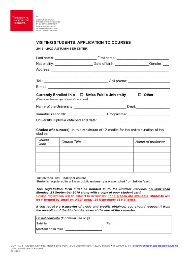 VISITING STUDENTS: APPLICATION TO COURSES 2019 2020 AUTUMN Semesters name: ___ First name: ___ Nationality: ___ Date of birth: ___Gender: ___ Address: ___ ___ Tel.: ___ Cell phone: ___ Email: ___