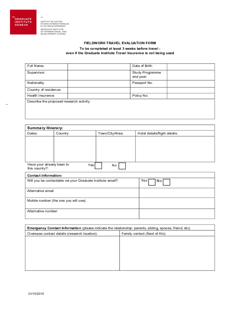 FIELDWORK TRAVEL EVALUATION FORM To be completed at least 3 weeks before travel even if the Graduate Institute Travel Insurance is not being used Full Name:Date of Birth:Supervisor:Study Program and