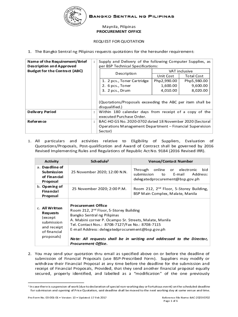 Manila, Filipinas PROCUREMENT OFFICE REQUEST FOR QUOTATION 1. The Bangkok Central NG Filipinas requests quotations for the hereunder requirement: Name of the Requirement/Brief Description and Approved
