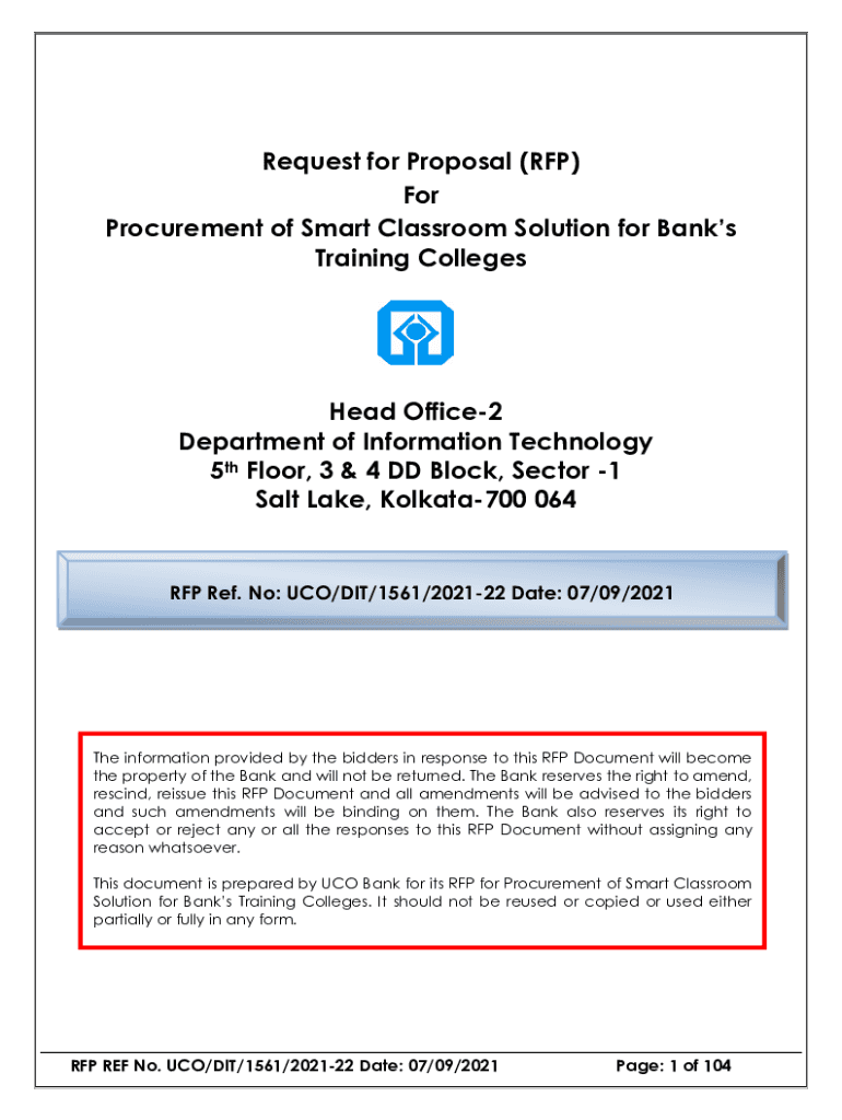Request for Proposal (RFP) For Procurement of Smart Classroom Solution for Banks Training Colleges Head Office2 Department of Information Technology 5th Floor, 3 & 4 DD Block, Sector 1 Salt Lake,