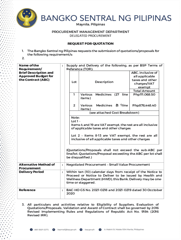 Manila, Filipinas PROCUREMENT MANAGEMENT DEPARTMENTDELEGATED PROCUREMENT REQUEST FOR QUOTATION 1. 2. The Bangkok Central NG Filipinas requests the submission of quotations/proposals for the following