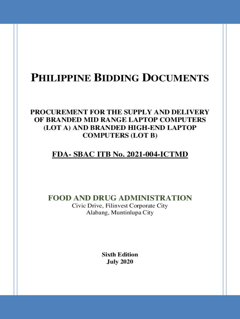 PHILIPPINE BIDDING DOCUMENTS PROCUREMENT FOR THE SUPPLY AND DELIVERY OF BRANDED MID RANGE LAPTOP COMPUTERS (LOT A) AND BRANDED High-end LAPTOP COMPUTERS (LOT B)FDA SAC ITB No. 2021004ICTMDFOOD AND