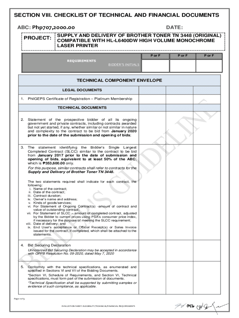 SECTION VIII. CHECKLIST OF TECHNICAL AND FINANCIAL DOCUMENTS ABC: Php707,2000.00 PROJECT:DATE:SUPPLY AND DELIVERY OF BROTHER TONER TN 3448 (ORIGINAL) COMPATIBLE WITH HLL6400DW HIGH VOLUME MONOCHROME