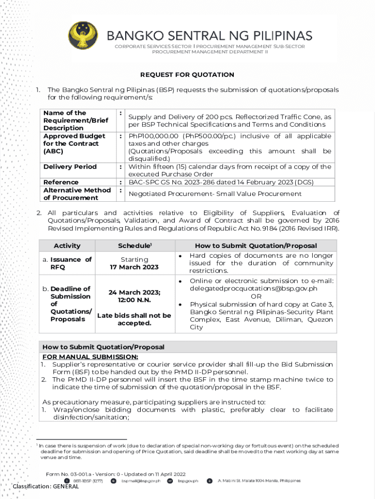 CORPORATE SERVICES SECTOR I PROCUREMENT MANAGEMENT SUBSECTION PROCUREMENT MANAGEMENT DEPARTMENT REQUEST FOR QUOTATION 1. The Bangkok Central NG Filipinas (BSP) requests the submission of quotations/proposals