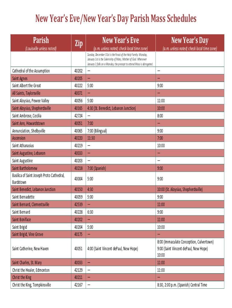 New Year's Eve/New Year's Day Parish Mass Schedules Parish(Louisville unless noted)New Years Even(p.m. unless noted; check local time zone)New Year's Day(a.m. unless noted; check local time zone)Sunday,