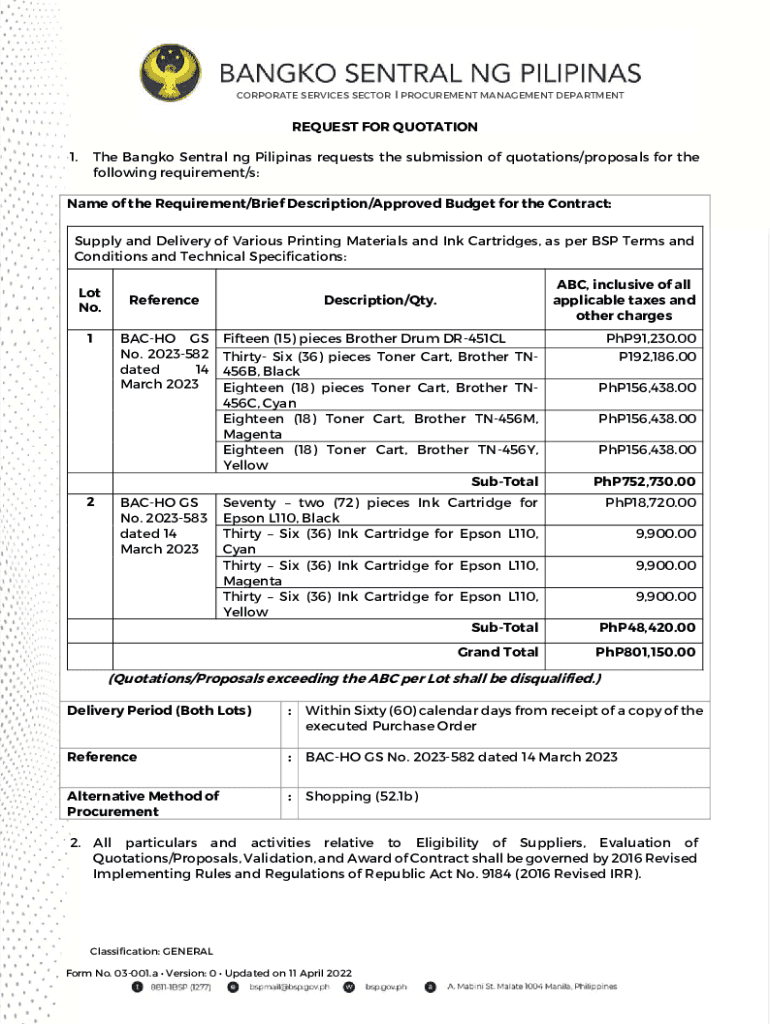 CORPORATE SERVICES SECTOR I PROCUREMENT MANAGEMENT DEPARTMENTREQUEST FOR QUOTATION 1. The Bangkok Central NG Filipinas requests the submission of quotations/proposals for the following requirement/s:Name