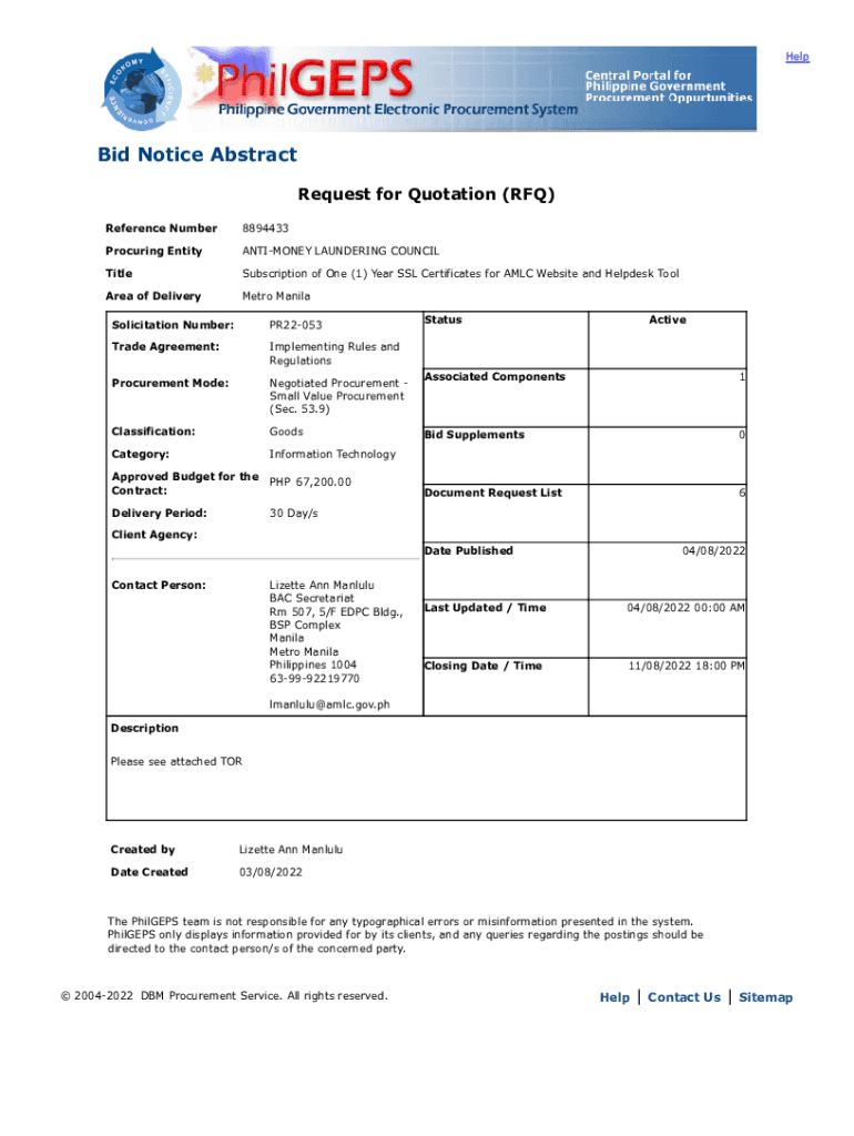 Reference Number8894433Procuring EntityANTIMONEY LAUNDERING COUNCILTitleSubscription of One (1) Year SSL Certificates for AMC Website and Help desk