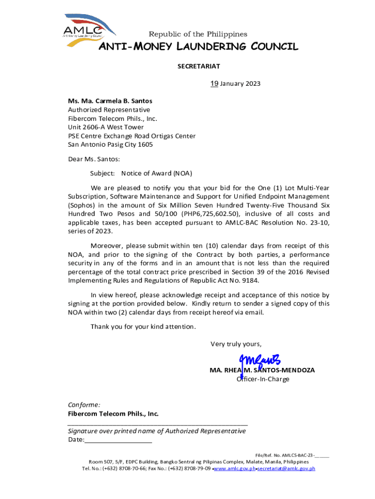 Republic of the PhilippinesANTIMONEY LAUNDERING COUNCIL SECRETARIAT 19 __ January 2023 Ms. Ma. Carmela B. Santos Authorized Representative Fiber com Telecom Phil's., Inc. Unit 2606A West Tower PSE