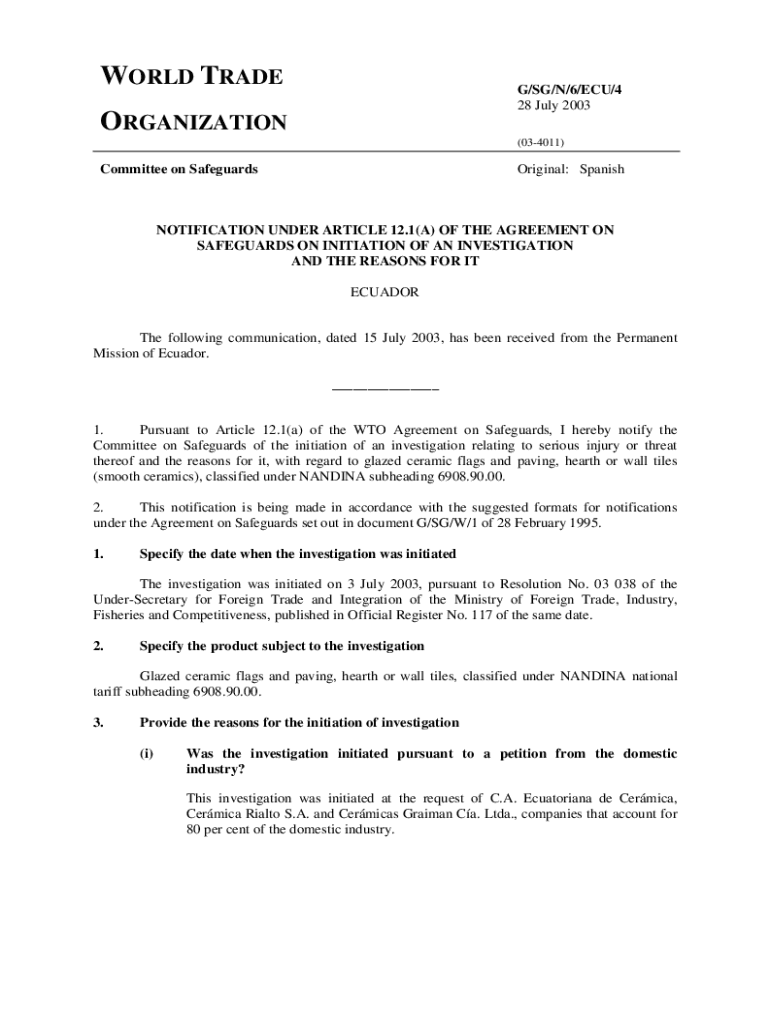 28 July 2003ORGANIZATION(034011)Original: SpanishCommittee on SafeguardsNOTIFICATION UNDER ARTICLE 12.1(A) OF THE AGREEMENT ON