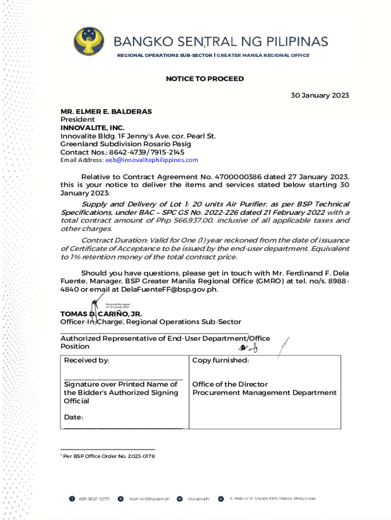 1REGIONAL OPERATIONS SUBSECTION I GREATER MANILA REGIONAL OFFICENOTICE TO PROCEED 30 January 2023 MR. ELMER E. CALDERAS President INNOVATIVE, INC. Innovative Bldg. 1F Jenny's Ave. cor. Pearl St. Greenland
