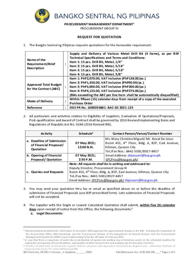 PROCUREMENT MANAGEMENT DEPARTMENT1 PROCUREMENT GROUP REQUEST FOR QUOTATION 1. The Bangkok Central NG Filipinas requests quotations for the hereunder requirement:Name of the Requirement/Brief Description:Approved