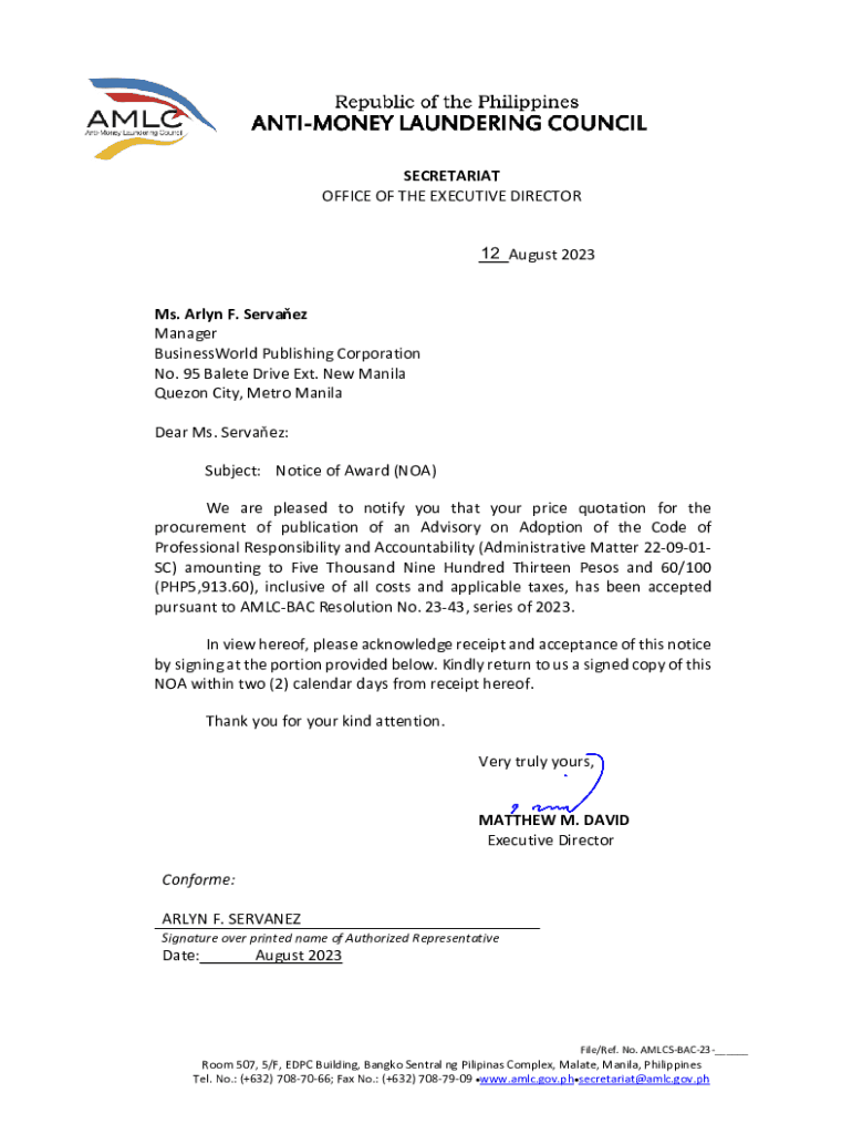SECRETARIAT OFFICE OF THE EXECUTIVE DIRECTOR 12 August 2023 ___ Ms. Allyn F. Served Manager Businesswoman Publishing Corporation No. 95 Ballet Drive Ext. New Manila Quezon City, Metro Manila Dear