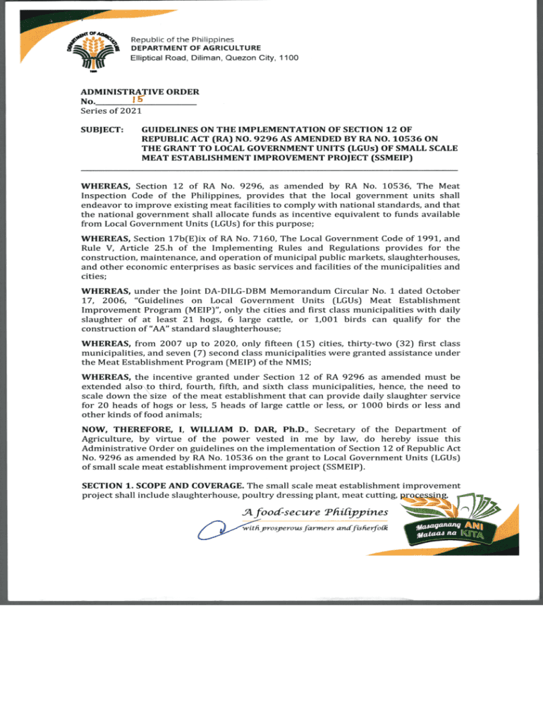Republic of the Philippines DEPARTMENT OF AGRICULTURE Elliptical Road, Dalian, Quezon City, 1100ADMINISTRATIVE ORDER No.___ ___ Series of 2021 SUBJECT:GUIDELINES ON THE IMPLEMENTATION OF SECTION 12