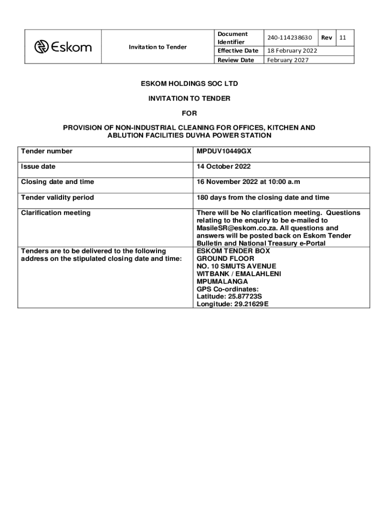 Document Identifier Effective Date Review DateInvitation to Tender240114238630Rev1118 February 2022 February 2027ESKOM HOLDINGS SOC LTD INVITATION TO TENDER FOR PROVISION OF NONINDUSTRIAL CLEANING