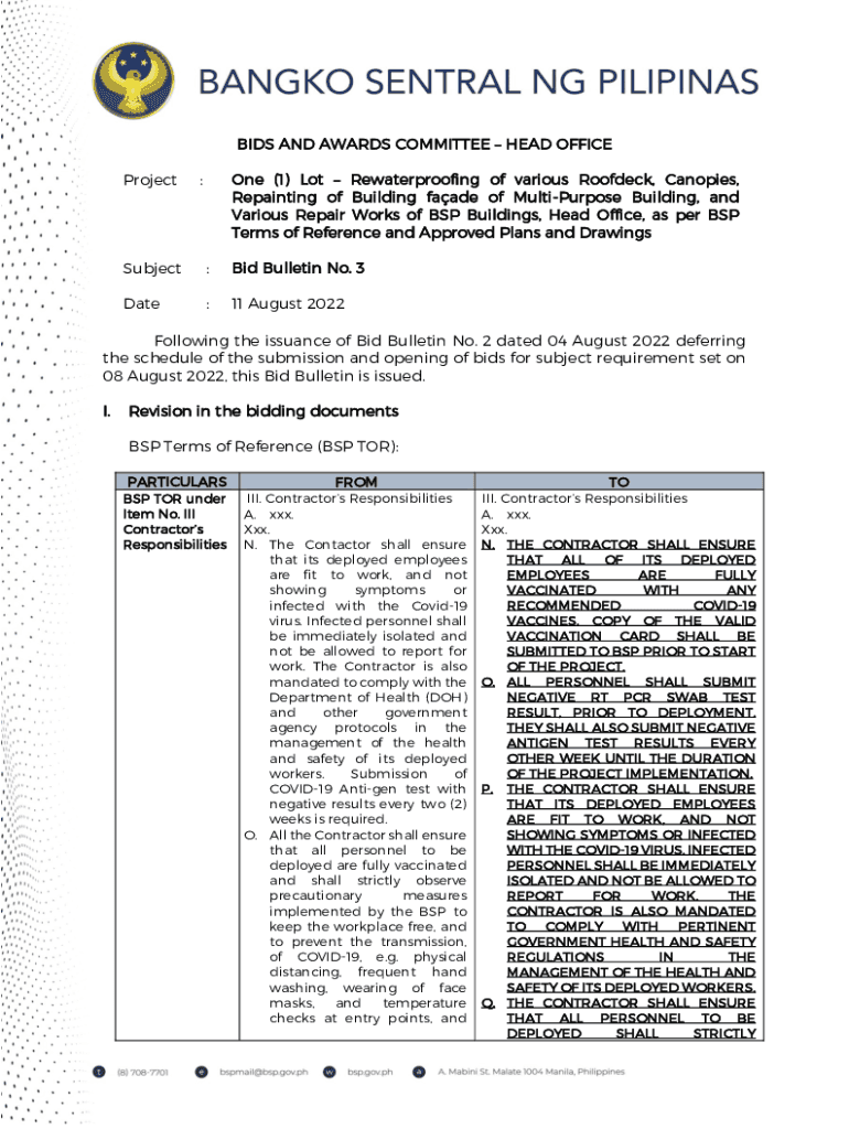 BIDS AND AWARDS COMMITTEE HEAD OFFICE Project:One (1) Lot Re waterproofing of various Roof deck, Canopies, Repainting of Building facade of Multipurpose Building, and Various Repair Works of BSP Buildings,
