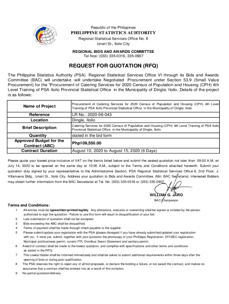Republic of the PhilippinesPHILIPPINE STATISTICS AUTHORITY Regional Statistical Services Office No. 6 Impart St., Lilo City REGIONAL BIDS AND AWARDS COMMITTEE Tel Nos: (033) 3350316, 3350907REQUEST