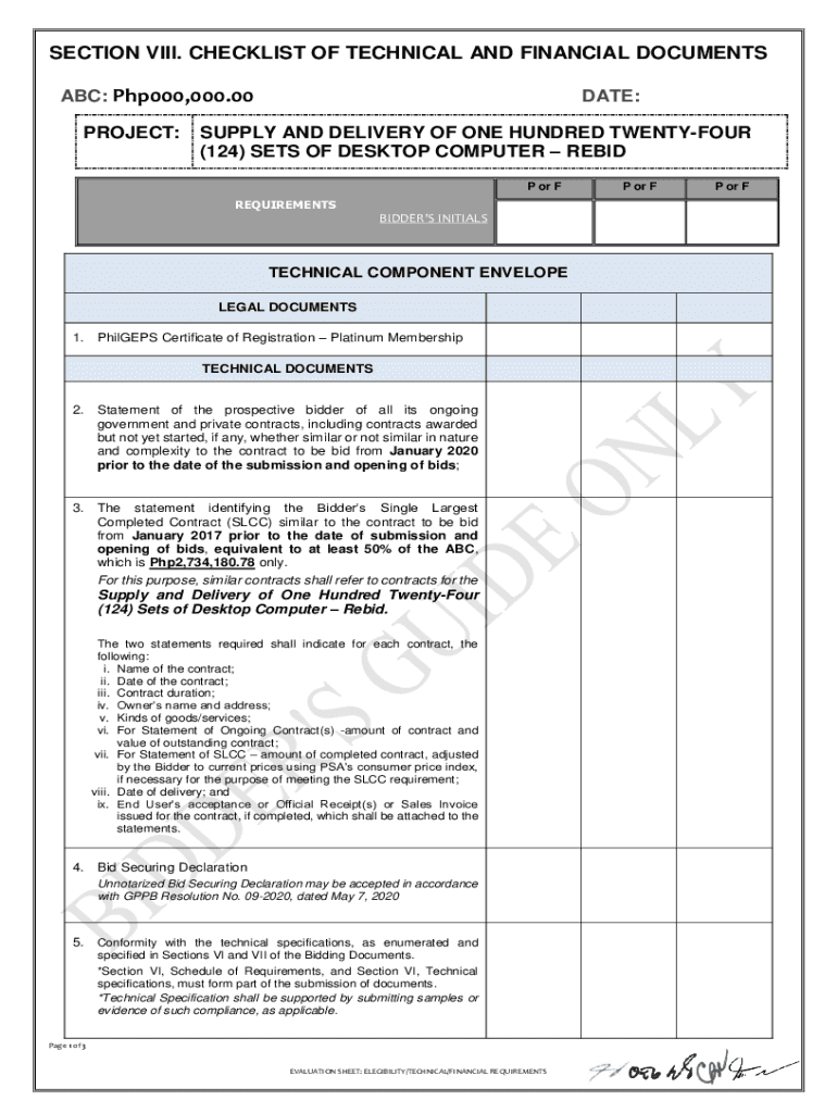SECTION VIII. CHECKLIST OF TECHNICAL AND FINANCIAL DOCUMENTS ABC: Php000,000.00 PROJECT:DATE:SUPPLY AND DELIVERY OF ONE HUNDRED TWENTYFOLD (124) SETS OF DESKTOP COMPUTER REBID P or F REQUIREMENTSBIDDERS