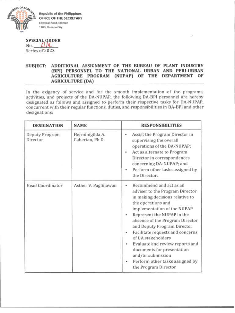 Republic of the Philippines OFFICE OF THE SECRETARY Elliptical Road, Dalian 1100 Quezon Gender Series subject:ADDITIONAL ASSIGNMENT OF THE BUREAU OF PLANT INDUSTRY (BPI) PERSONNEL TO THE NATIONAL
