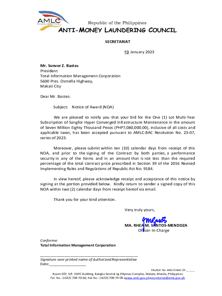 Republic of the PhilippinesANTIMONEY LAUNDERING COUNCIL SECRETARIAT __ January 2023 19 Mr. Sunder Z. Bastes President Total Information Management Corporation 5600 Pres. ISMEA Highway, Marathi City