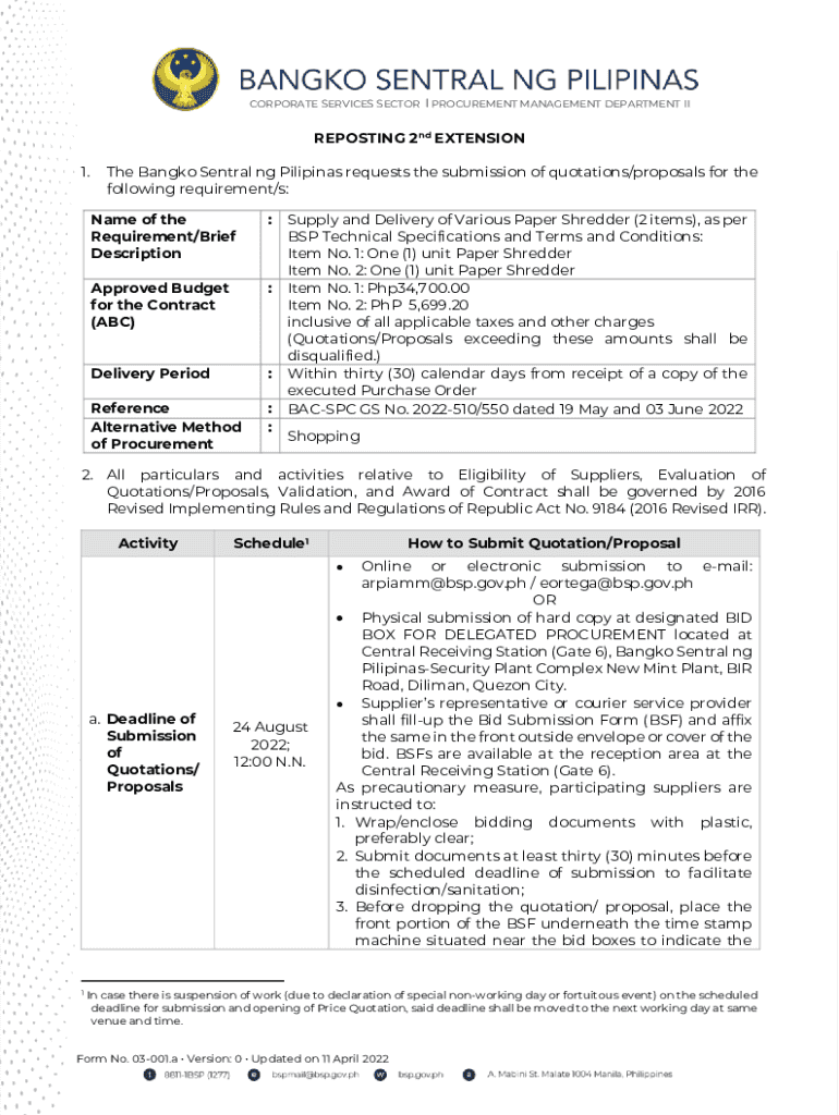 CORPORATE SERVICES SECTOR I PROCUREMENT MANAGEMENT DEPARTMENT REPOSTING 2nd EXTENSION 1. The Bangkok Central NG Filipinas requests the submission of quotations/proposals for the following requirement/s: