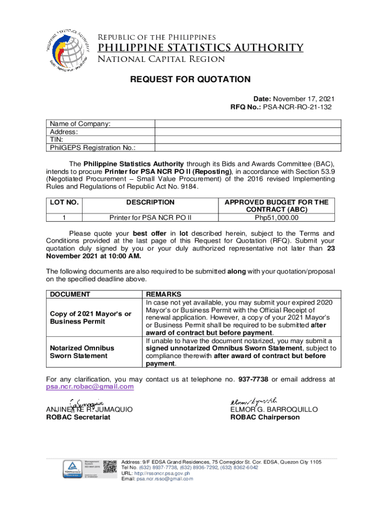 Republic of the PhilippinesPHILIPPINE STATISTICS AUTHORITY National Capital Region REQUEST FOR QUOTATION Date: November 17, 2021, RFQ No.: PSANCRRO21132 Name of Company: Address: TIN: Phillips Registration