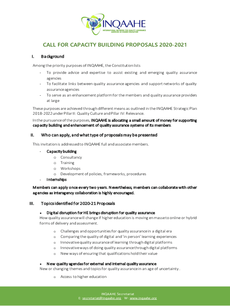 CALL FOR CAPACITY BUILDING PROPOSALS 20202021 I. BackgroundAmong the priority purposes of INTAKE, the Constitution lists To provide advice and expertise to assist existing and emerging quality assurance