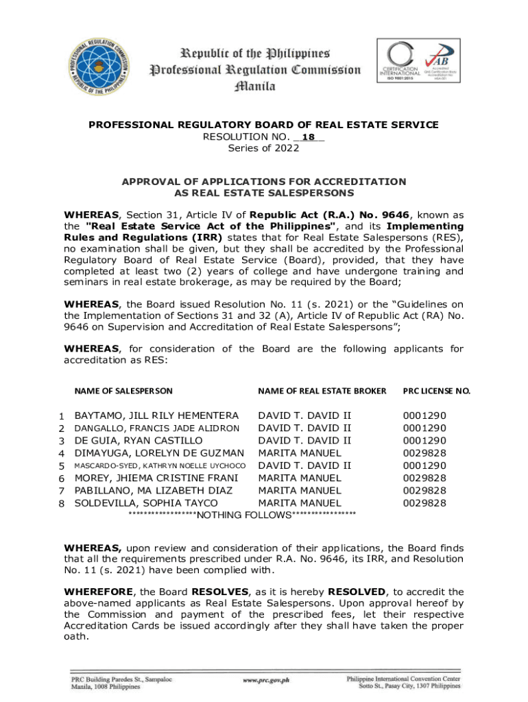 PROFESSIONAL REGULATORY BOARD OF REAL ESTATE SERVICE RESOLUTION NO. ___ 18 Series of 2022 APPROVAL OF APPLICATIONS FOR ACCREDITATION AS REAL ESTATE SALESPERSONS WHEREAS, Section 31, Article IV of