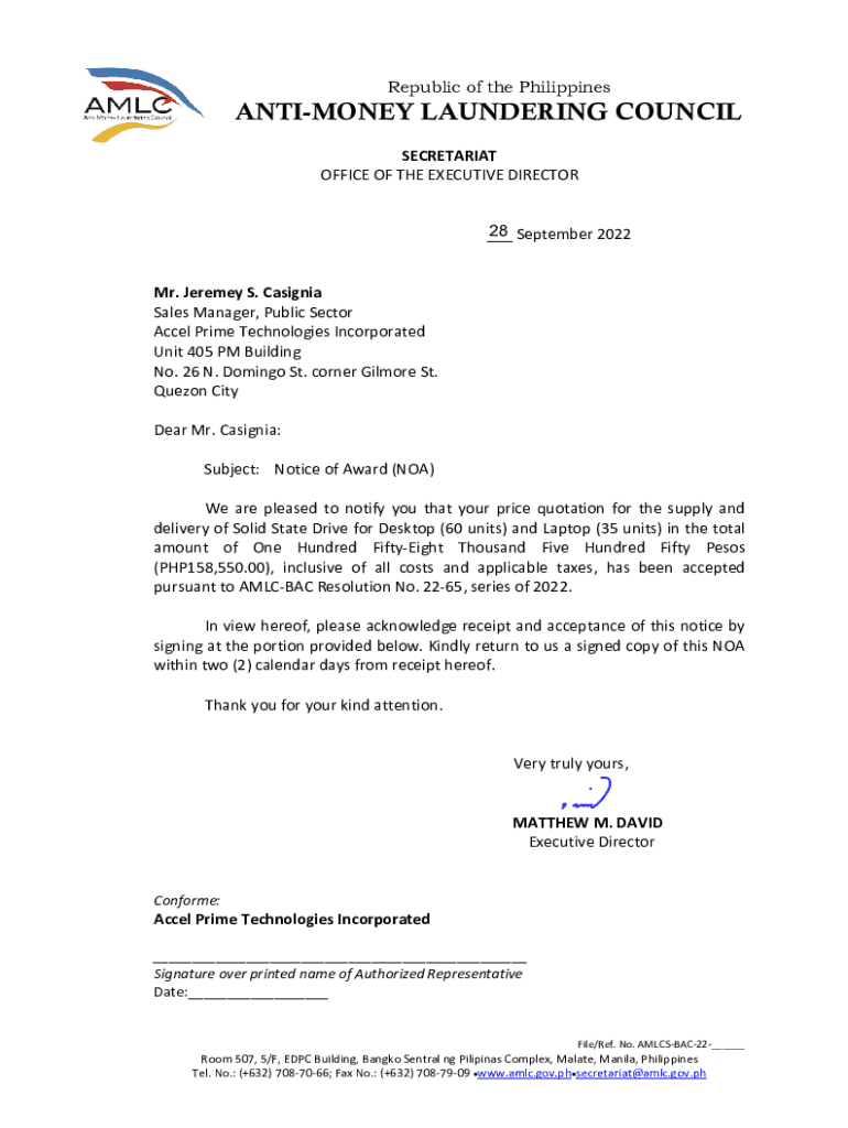 Republic of the PhilippinesANTIMONEY LAUNDERING COUNCIL SECRETARIAT OFFICE OF THE EXECUTIVE DIRECTOR 28 September 2022 ___ Mr. Jeremy S. Insignia Sales Manager, Public Sector AFCEL Prime Technologies
