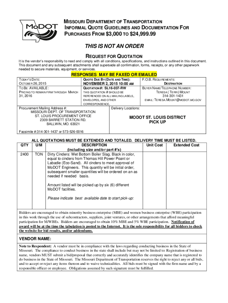 MISSOURI DEPARTMENT OF TRANSPORTATION INFORMAL QUOTE GUIDELINES AND DOCUMENTATION FOR PURCHASES FROM $3,000 TO $24,999.99 THIS IS NOT AN ORDER REQUEST FOR QUOTATION It is the vendors' responsibility