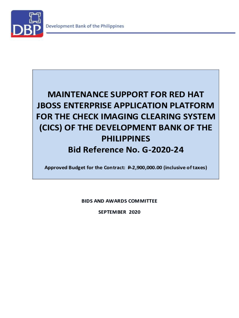 MAINTENANCE SUPPORT FOR RED HAT BOSS ENTERPRISE APPLICATION PLATFORM FOR THE CHECK IMAGING CLEARING SYSTEM (CICS) OF THE DEVELOPMENT BANK OF THE PHILIPPINES Bid Reference No. G202024 Approved Budget