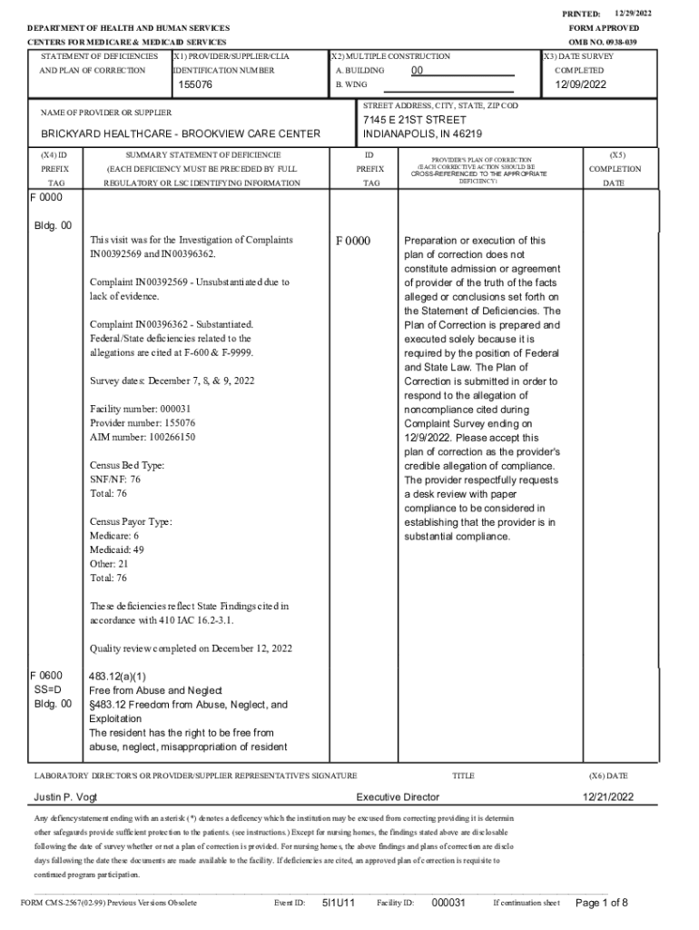 12/29/2022PRINTED: DEPARTMENT OF HEALTH AND HUMAN SERVICESFORM APPROVEDCENTERS FOR MEDICARE & MEDICAID SERVICES STATEMENT OF DEFICIENCIES(X1) PROVIDER/SUPPLIER/LIGAND PLAN OF CORRECTIONIDENTIFICATION