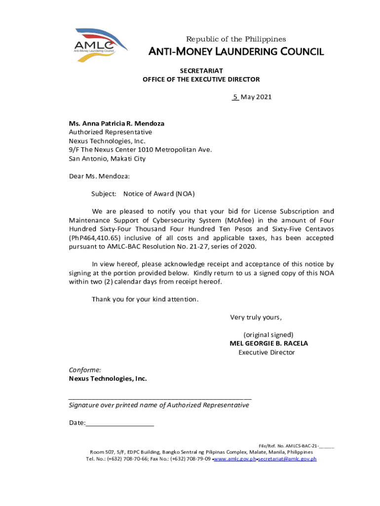 Republic of the PhilippinesANTIMONEY LAUNDERING COUNCIL SECRETARIAT OFFICE OF THE EXECUTIVE DIRECTOR 5 May 2021Ms. Anna Patricia R. Mendoza Authorized Representative Nexus Technologies, Inc. 9/F The