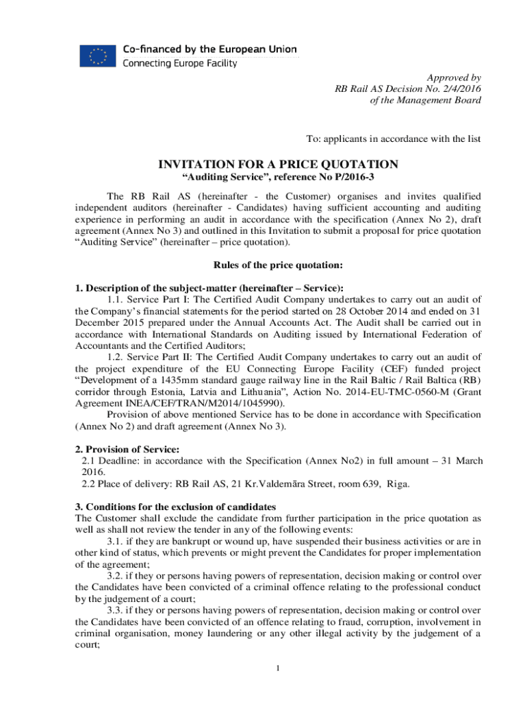 Approved by RB Rail AS Decision No. 2/4/2016 of the Management Board: applicants in accordance with the listINVITATION FOR A PRICE QUOTATION Auditing Service, reference No P/20163 The RB Rail AS (hereinafter