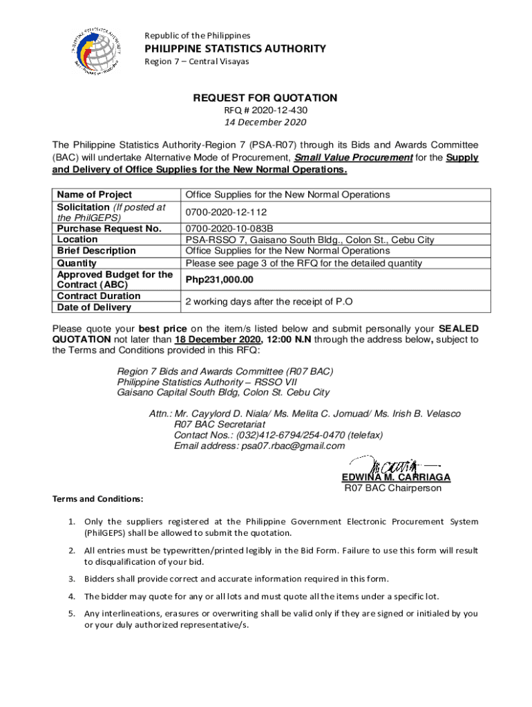 Republic of the PhilippinesPHILIPPINE STATISTICS AUTHORITY Region 7 Central VisayasREQUEST FOR QUOTATION RFQ # 202012430 14 December 2020 The Philippine Statistics AuthorityRegion 7 (PSAR07) through